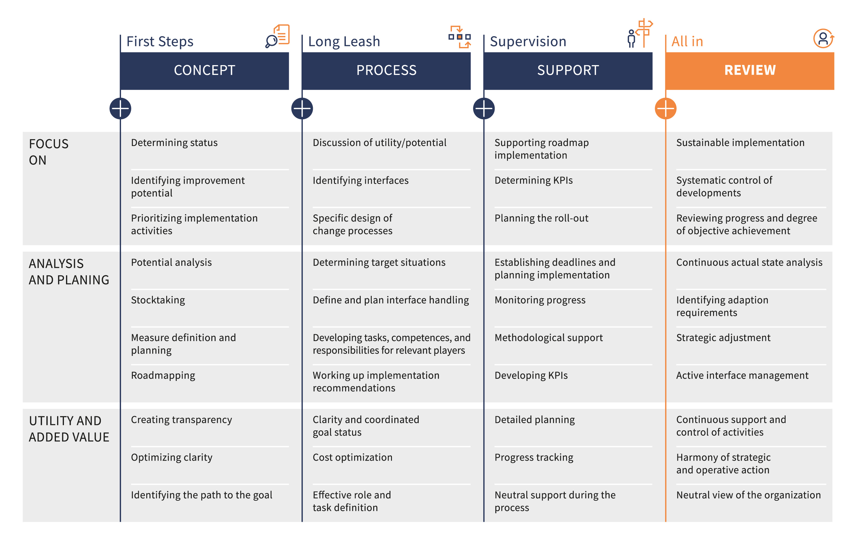 Change is tricky, no matter whether it involves selective improvement or large-scale transformation. Change often fails because companies take on too much at the beginning. Our advice is: Start small, get results, and take it a step at a time. That is just what our concept aims for. Each workshop package delivers solutions, and all solutions fit together. You can decide which package you would like: From a single concept workshop to a full-service package. Whatever you choose, we will support and monitor the implementation of the solutions you have generated. Incrementally and consistently.